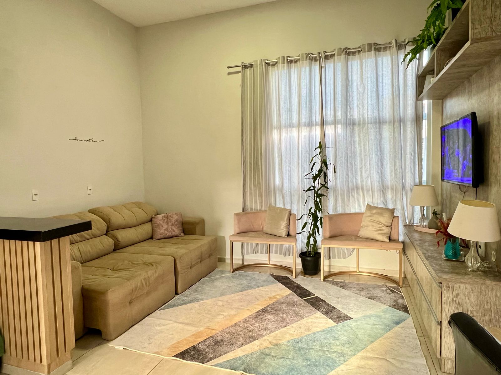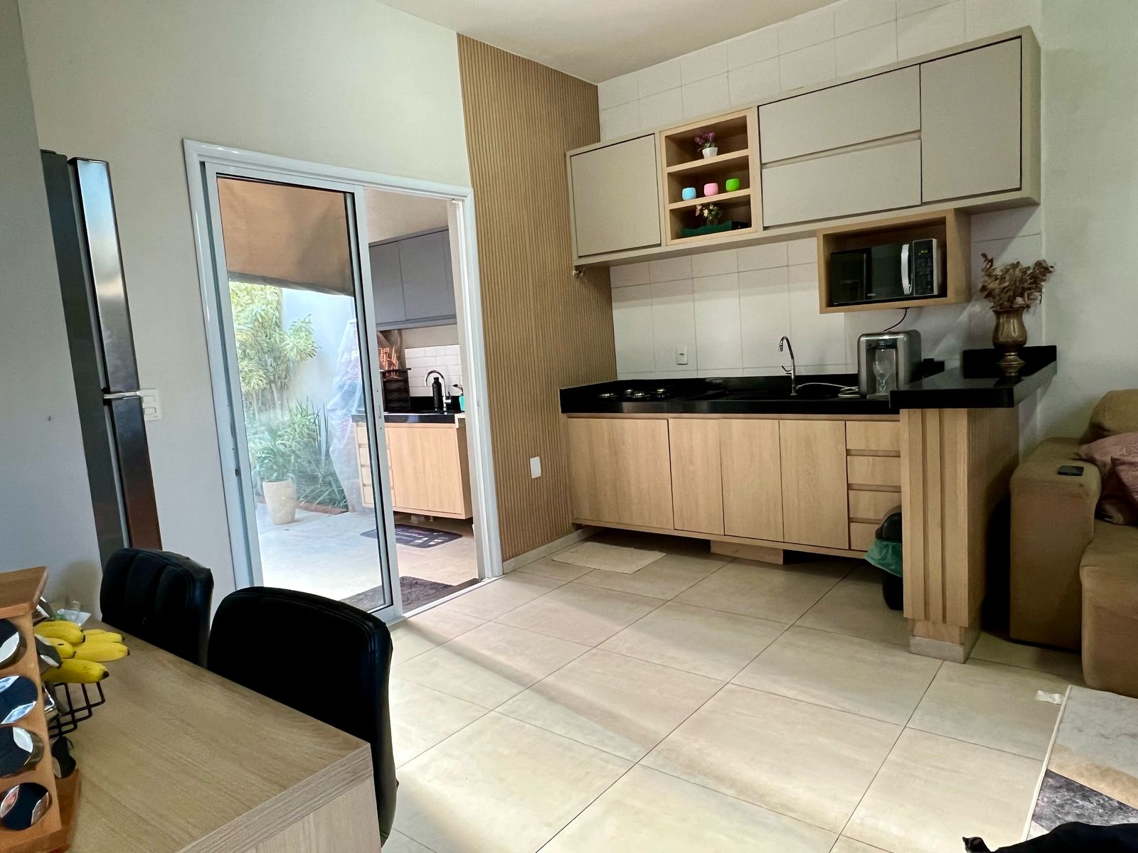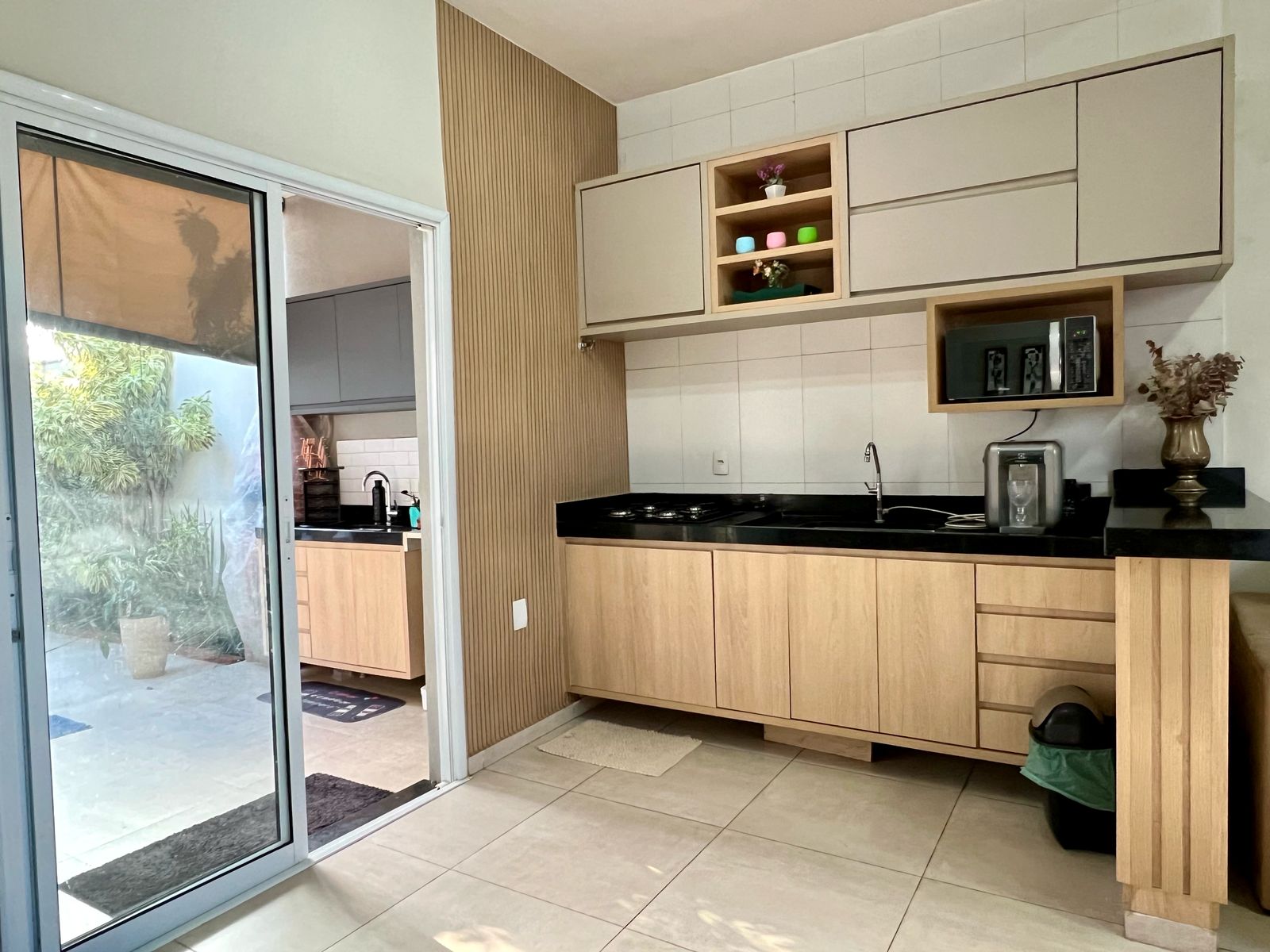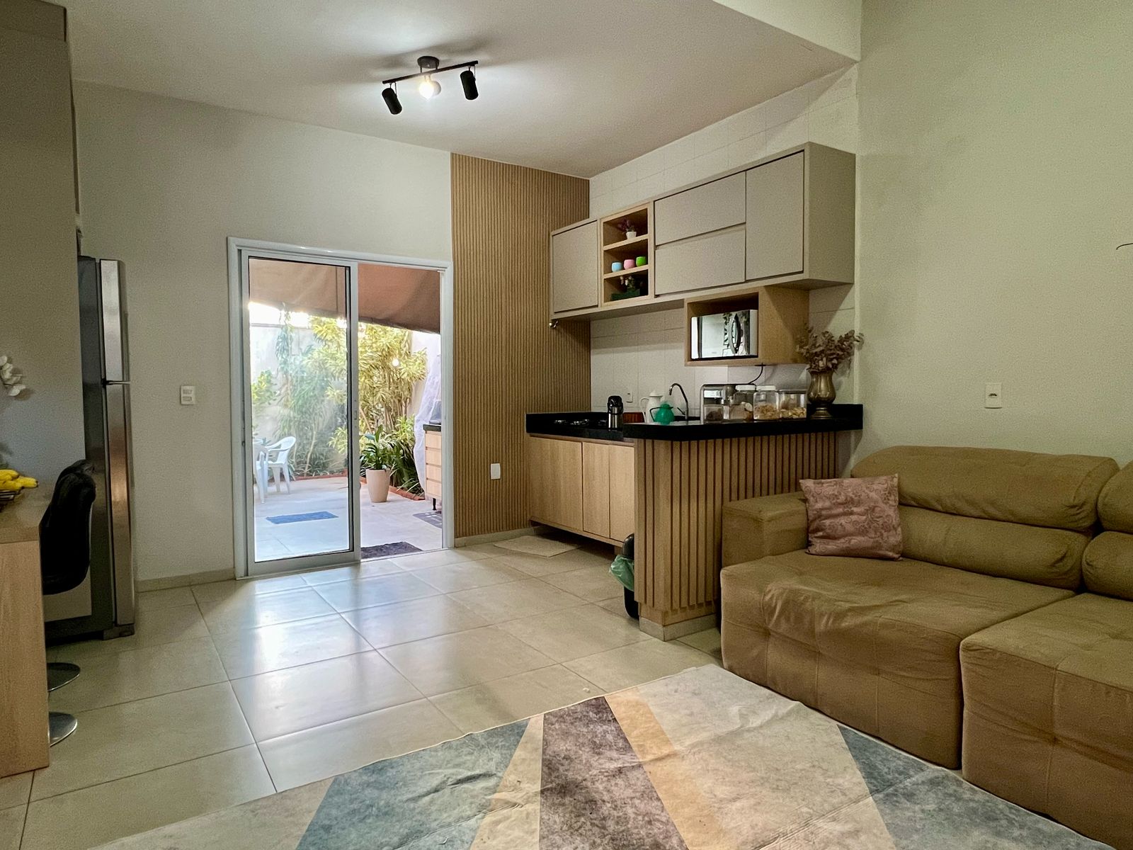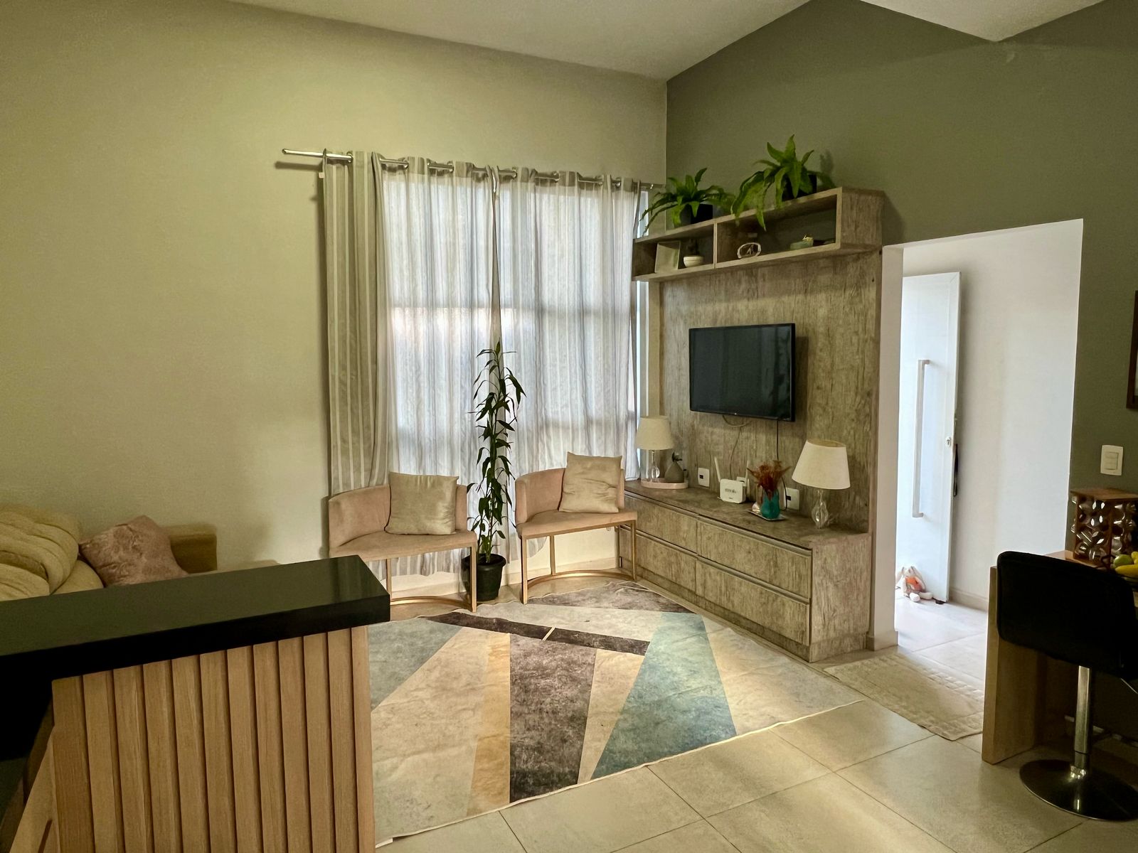 Sala de estar integrada à cozinha, criando um ambiente moderno, leve e ideal para quem valoriza convivência em família ou com amigos;